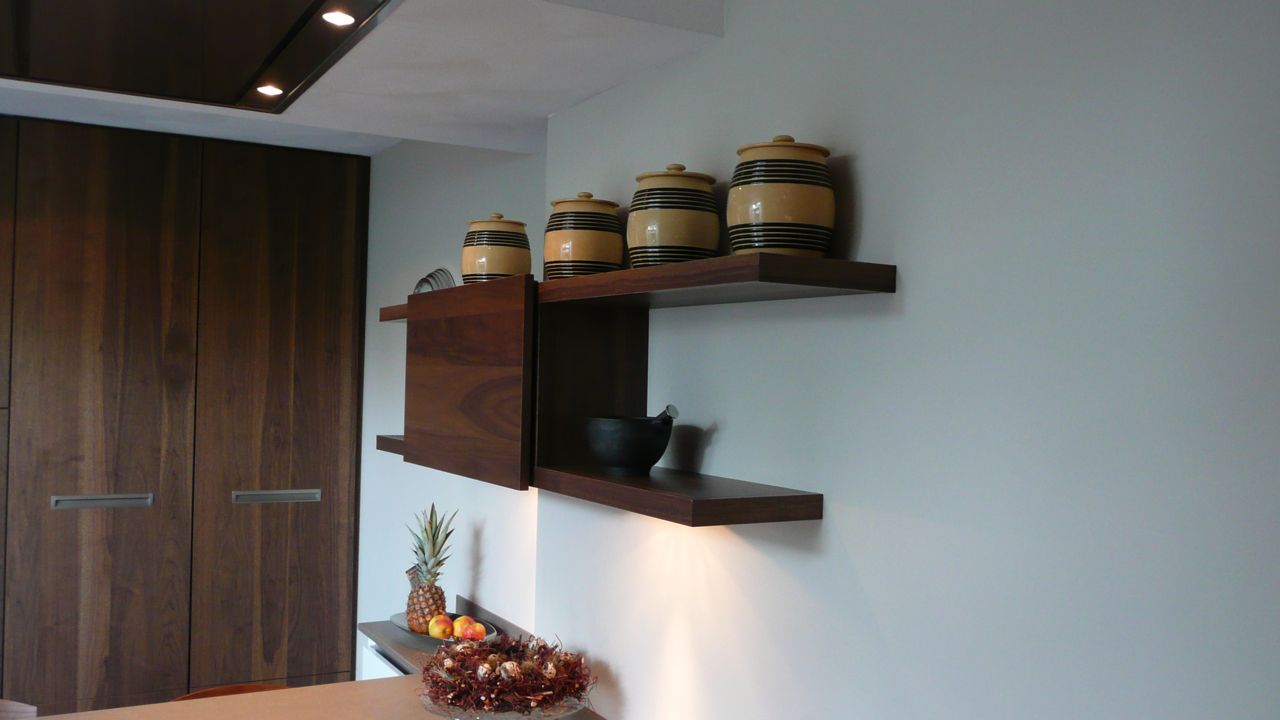 Deze moderne keuken met Ceramistone werkblad en geïntegreerde kookpitten heeft een strakke uitstraling maar een warme look door het afwerking met notenhout. Deze 'zwevende' maatwerk keuken staat op onopvallende rvs pootjes en is volledig handgemaakt. De keuken is van alle moderne gemakken voorzien, zoals een Ceramistone werkblad (tegen alles bestand), Pitt-Cooking gasbranders rechtstreeks in het blad en greeploze, elektrische lades.